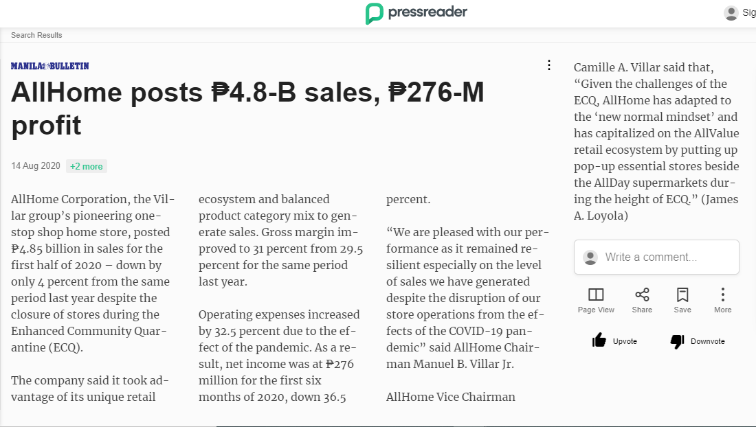 “We are pleased with our performance as it remained resilient especially on the level of sales we have generated despite the disruption of our store operations from the effects of the COVID-19 pandemic” said AllHome Chairman Manuel B. Villar Jr.
