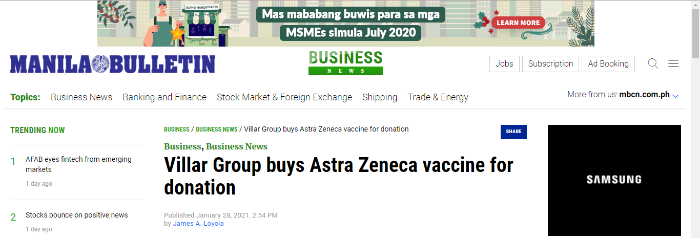 READ THE ARTICLE HERE: https://mb.com.ph/2021/01/28/villar-group-buys-astra-zeneca-vaccine-for-donation/